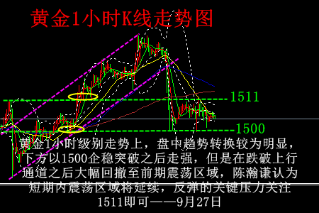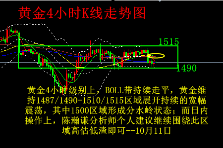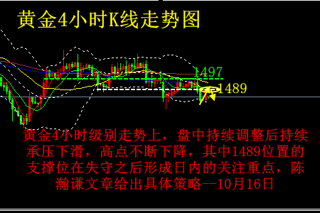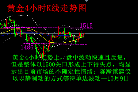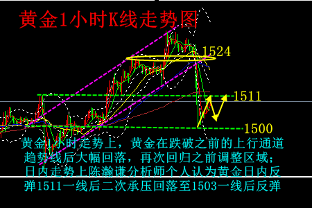 陈瀚谦:K线阴阳交错调整,黄金1490做多至1503 今日又到周五,黄金昨日价格再次上演小单边波动;昨日黄金开盘后快速上涨刷新1516盎司/美元的高点后回落至1507上下调整,欧盘后连续上行冲击1510一线位置后调整回落,美盘后受到数据影响,短线刷新高点1511.3盎司/美元后快速回落,并且在跌破1504的支撑位后触及1500关口位置,随后二次反弹承压1504后回落下破,盘中直接击穿1500关口后快速下跌至1491的日内低点后反弹调整,晚间反弹二次承压1499后回落至1490上方震荡,收盘于1493.8盎司/美元; 黄金技术面上,昨日黄金价格盘中早间冲高后回落,欧盘连续反弹承压之后于晚间美盘