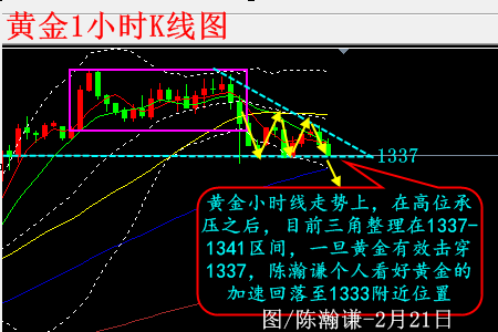 陈瀚谦:黄金欧盘预期--跌破1337将加速看向1333 今日周四,在今日凌晨时段的美联储利率决议公布之后,黄金价格自高位1346跳水10美金至1336.7后反弹,收盘在1338后,日K线收阴结束近期的四连阳状态;今日早盘黄金在1338.7盎司/美元开盘之后维持调整,早盘冲击1341.3后回落至1337.3止跌反弹,二次试探1340.5后承压,目前调整在1338上方位置,行情波动不大; 黄金技术面上,今日早间文章当中,陈瀚谦已经对日线的大级别走势作了分析,本文只分析4小时和1小时级别走势,需要查看早间文章的,可以自行搜索查看即可;4小时线上,金价维持整理,K线三连阴之后收取十字星站稳调整,运行