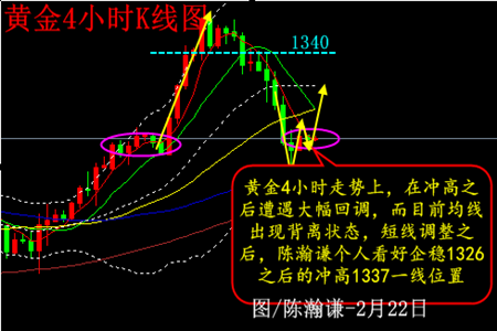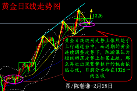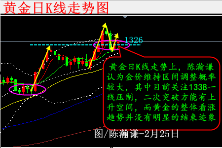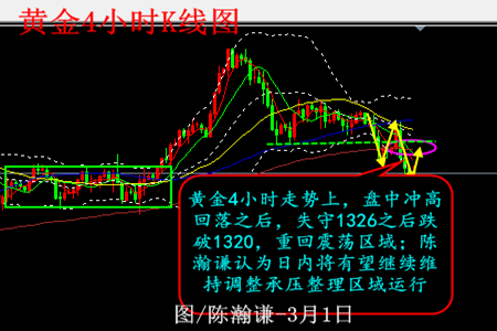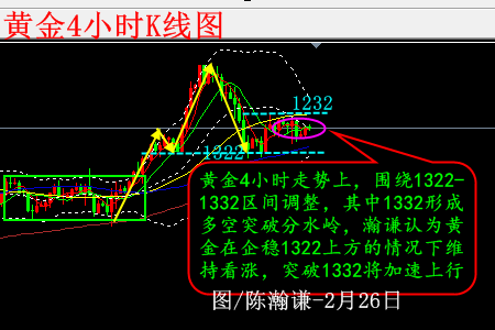 陈瀚谦:二次反弹,黄金将以1332展开调整 今日又是周一,也是本月的最后一个交易周,回顾2月份的黄金走势,就是多头强势,偶尔遭遇多头了结之后的修正局势,进而二次筑底走高,其中以上周的走势更加明显;上周黄金开盘1320.2,周一维持调整之后,周二当中,黄金自低位连续走高,并且盘中连续突破压力位之后于周三创下1346.5的年内高位,而后金价多头开始获利了结,周四金价遭遇强势修正,盘中大幅下挫,最低至1320.8,几乎回吐所有涨幅;而周五金价维持区间整理,日内低位整理,盘中连续触及1321.5支撑后反弹,周五晚间二次拉升冲高,刷新1332.9盎司/美元的高位后,回落至1328.2盎司/美元收盘,周