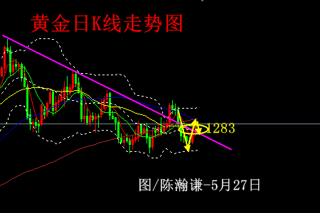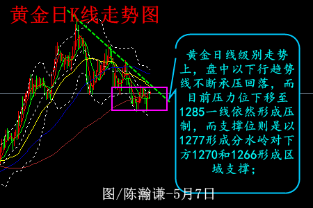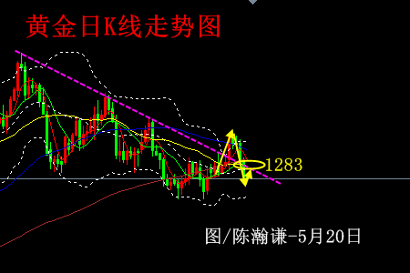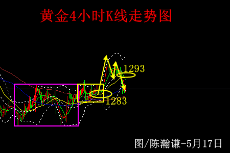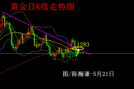 陈瀚谦:冲击1290承压,金价以1285再看调整 昨日周三,黄金价格自本周初开始的震荡上行走势在昨日日内继续延续;昨日黄金早盘开盘以1284一线温和调整,欧盘后以1287一线持续走高后刷新1291.3盎司/美元的日内高位,同时也是黄金自4月12日以来的新高点位后承压,美盘后黄金价格自1290一线跳水回落并且在跌破1285后加速回落,晚间至1279的日内低位后反弹至1280上下波动,收复于1280.7盎司/美元,日K线收取长上影阴线;今日早盘黄金开盘后冲击1282.5一线后承压回落至1279上方反弹至1281上下位置运行; 黄金技术面上,昨日黄金价格自1284一线冲击且企稳1287后快速拉升至