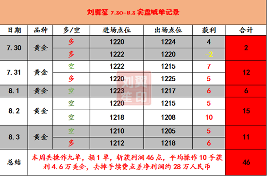 是否有点似曾相识,我们每天都在喊着顺势为王,却在这句口号中屡屡亏损,是这句错了吗?刘翼笙告诉你,这句话是投资真谛,错的是你压根没有看清趋势,何来顺势?你以为顺势只有多空之分吗?行情在很多时候没有简单的单边行情,更多情况下都是震荡,那么震荡是否也是一种趋势,拿着单边的节奏做震荡的行情,这才是赤裸裸的逆势强做单,说了那么多的消息面影响,难道消息面一天利多黄金一天利空黄金,上午利多下午利空吗,没有对行情清晰的认识,就不要再谈什么顺势为王,因为你理解的顺势根本就是在和行情反着来。 ——一周之内震荡之中豪取49点,8.2黄金空多连续获利你把握住了吗?—— 上周共计喊单9次,盈利8单,一单保本,盈利49