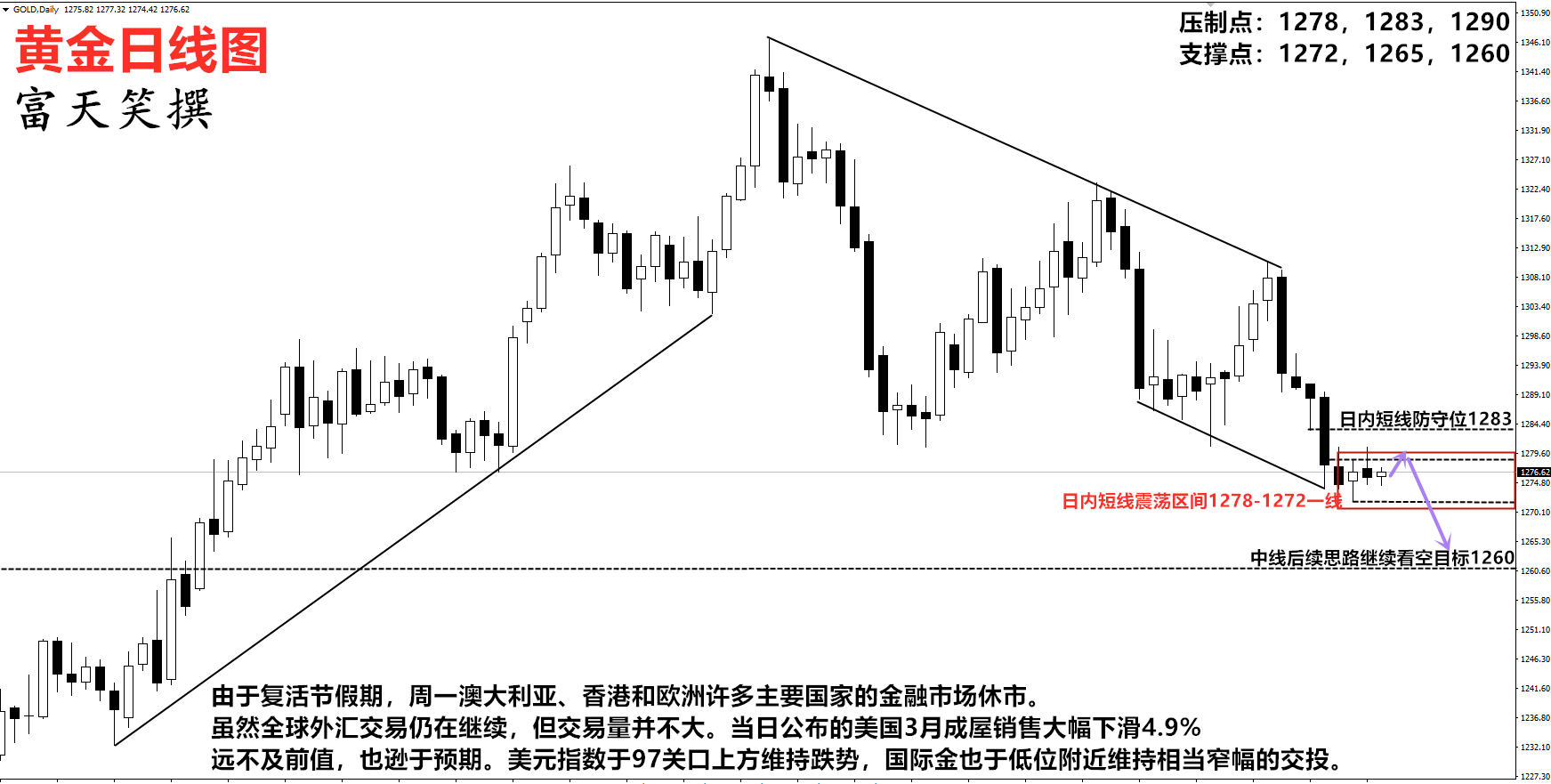 看到我的文章的投资朋友你们好,你遇到问题来问,不用怕麻烦我,我最闹心就是给了意见你也不知道我给了,还觉得我什么都没讲,那样我更沮丧!由于复活节假期,周一澳大利亚、香港和欧洲许多主要国家的金融市场休市。虽然全球外汇交易仍在继续,但交易量并不大。当日公布的美国3月成屋销售大幅下滑4.9%,远不及前值,也逊于预期。美元指数于97关口上方维持跌势,国际金也于低位附近维持相当窄幅的交投。 ——对本交易日布局注意几点—— 本交易日开盘,国际金金位于1276附近水平徘徊。上一交易日金价先温和涨至1279.70美元,之后自该点展开回撤,当日以阴线小幅收跌。本交易日目前来看,金价暂时维持窄幅交投。 1),单边