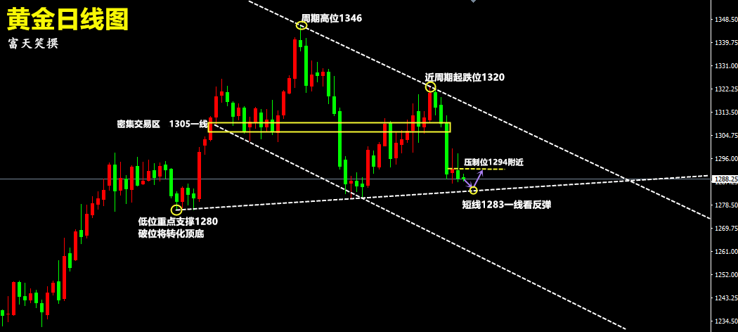 套仓的投资朋友们,由于富天笑不知你的实际套仓点位、实际仓位风险等具体情况,不能给出相应的策略。那么有需要的朋友可以单线富天笑,在此本人还是建议各位投资朋友以后做单不要抗单,仓位不要过重,避免下次再套,不是每次都是可以成功离场,不是每次都顺心如意,每一次的做单是应该有计划的做单; --1283反弹就是多,空头不变看反弹-- 短周期的弱势格局很显然没有改变,1290破位后接下来市场要测试的依然是前期盘中1283和1276这2个关键的支撑点位置,目前可以认为1290也将从支撑转变为阻力,而图中1294的压制位是笔者认为的第二大压制,两日一阳一阴但日线的上影线很长,压力可以说是很绝对的,而大周期13