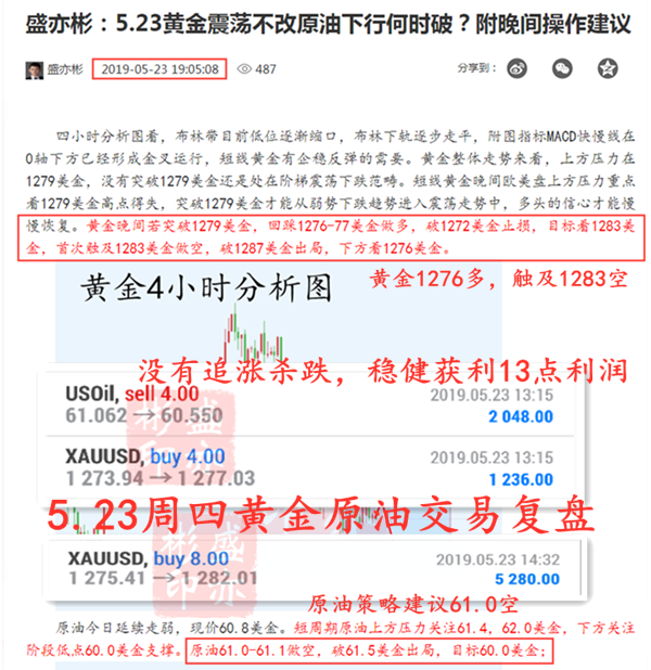 盛亦彬:5.24晚评黄金1279上多原油顺势空附交易总结 这两天行情可谓是波澜壮阔,跌宕起伏!每一次遇到这种大行情,总是几家欢喜几家愁!听了很多大道理,可依然做不好交易,学习了很多理论知识,可仍然不能游刃有余,如果我们不贪婪,我们不会被打败,如果我们不恐惧,我们将获得胜利,有时候想证明给一万个人看,但发现最后能懂的只有自己,市场的生存法则就是弱肉强食,注定有一批人将被市场所淘汰,战争不会给军人解释的机会,大浪淘沙,沉者为金,在投资的市场里,亦彬syb806与你共同前行! 5.20周一黄金原油交易复盘,抓住5个点利润: 黄金多单:1276进场到1278出场,抓住1个点利润; 原油空单:63.4