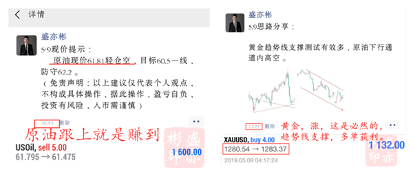 盛亦彬:5.13黄金原油最新行情分析5.13黄金原油 实力不是吹牛,必然是更多人的认可。做好自己远比想着别人来验证你的实力重要,是骡子是马拉出来遛一遛就知道了。在其职,谋其事,我一直孜孜不倦的劝导,希望你们在这个市场能少走一点弯路,少错一单。即使我苦口婆心,但是投资的路还是要自己走,学无止境,学到了经验才是你的财富。 恭喜李先生(2019.05.06-2019.05.10)一周超出预期,斩获15万9人民币: 上周黄金交易比较稳定,每一单利润都不多,但积少成多之下也有很多利润;而原油行情振幅较大,周初稳健布局,抓住了不少的利润;相比前几周,上周原油利润增长较多;为什么我们能连胜不断,因为我们的