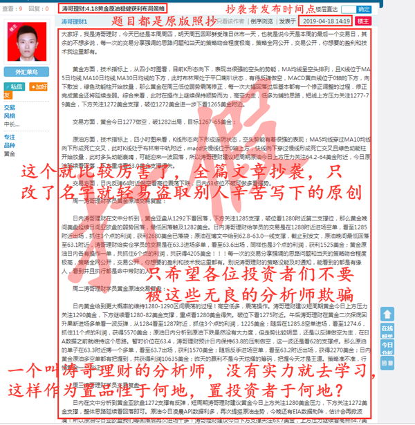 盛亦彬:4.18你所选择的分析师是真正有实力还是虚假的呢? 大家晚上好,我是盛亦彬,首先来说下这篇文章里面没有关于黄金原油午夜行情分析及每日总结的内容,因为这是一篇打假分析师的文章,不管你是新手还是老手,请一定要耐心看完这篇文章。 大家都知道现在的投资理财市场鱼龙混杂,市场中不缺恶意刷单的分析师,不缺抄袭文章的分析师,只是没有想到有的人竟然全篇文章抄袭,实在是令人深恶痛绝。以下亦彬就举几个例子,有抄袭整个段落的,有抄袭全篇文章的: 先来看下这边盛亦彬的原创文章内容及发布时间点: 朋友圈实时更新的分析及策略发布时间点: 下面这些抄袭者是全段落抄袭,只改了改名字: 一个叫 李鼎缘 的分析师: 其