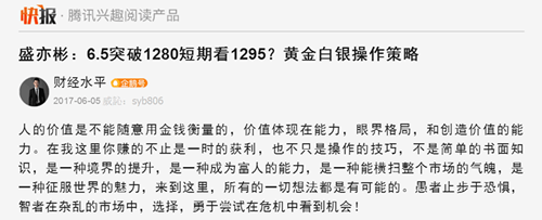 人生跌倒了很正常,自责只会增加伤痛,埋怨只会加重负累,伤心只会摧残自信,无奈只会凭添郁闷。何不拍拍身上的灰尘,勇敢的站起,去迎接明天的挑战,岂不是上上之选,明智之举! 盛亦彬:消息面解析 黄金周二(6月6日)亚洲时段盘初继续持稳在1280美元/盎司上方。周一(6月5日)因此前美国公布的就业数据令人失望,降低了美国