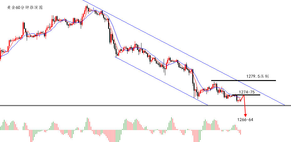 周一,黄金连续测试几次1279-80皆未果,美盘连阴下跌,自从起涨点1275跌破之后,注定多头疲软,尾盘低位收盘,日线最终报收倒锤子阴线。 昨日操作,白盘我们选择观望,美盘安排了一次1278的空,隔夜最低下跌至1273一线,接下来我们还是继续做空,希望不断做多的你能有所觉悟! 我说做空,并不仅仅因为昨日收了一根倒锤子阴线,当然,下跌过程中的倒锤子是看空的信号,而更重要的是当前的形态,首先当前形态是下跌,这一点毋庸置疑。 其次,1280双顶,多次测试不破,做多没有空间,逆势的风险也很大,做多实在给不出理由。 今天,我们就以1280为分水岭干空即可,如黄金60分钟推演图所示,双顶位置在1280,