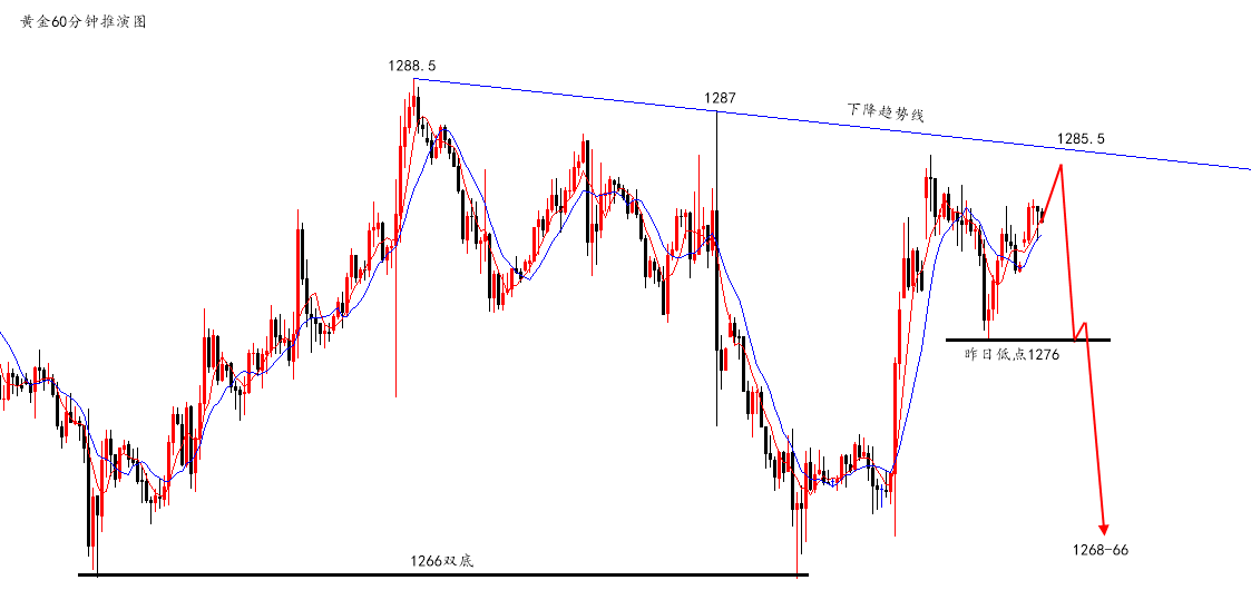 周一,黄金在避险情绪推动下跳空高开,但很遗憾,多头并未延续,亚盘慢跌,欧盘续跌,美盘前直接下探1276,虽探底回升,但日线收阴并未形成连阳。 昨日操作,我们根据“非农日探底回升,高位收盘,次日依托凌晨低点跟多”安排了一次1277-8的多,当然,在美盘22:00前没有形成有效反弹之时,我们保险起见,提示多单本位出局。 市场需要敬畏,有时候,预期结果未达到,根据行情我们应该进出都要果断,不管结果怎样都不要后悔。 说回黄金,金价自双底1266反抽之后,并未展现良好的延续性,既然如此,我们可以肯定的是,这一波上涨(1266-85)是“反抽”,而不是“反弹”,大的方向仍然是以1346为顶部的震荡式下跌