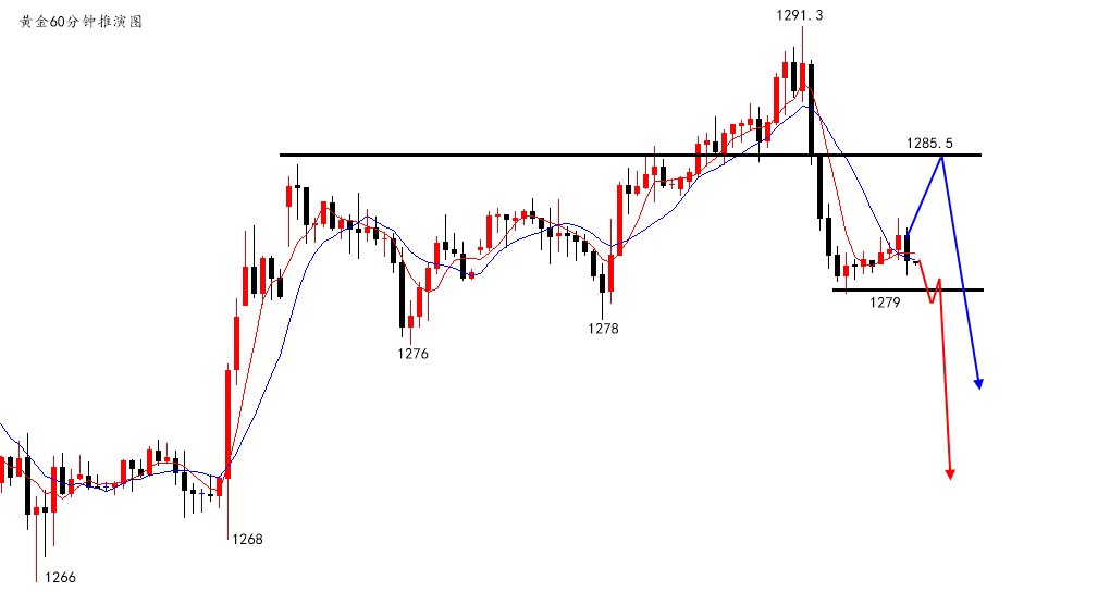 晚上好,老铁们! 黄金,今天的走势和昨日很像,早盘上涨,亚盘转跌回落,欧盘慢跌,美盘前出现空头信号,凌晨低点1280刺破了一次是空头信号。 同时,1H布林中轨也是毫无悬念的击穿,加上美元方面强势,黄金价格很有可能在美盘时段进一步下跌,去测试昨日低点1276一线。 至于能够迎来大跌,我其实不抱太大希望,毕竟今天下跌力度太小,仅仅4美金,说大跌也不太现实,我只能说不看好多头。 金价整体承压1H下降趋势线,阻力位关注1285.5,如果美盘时段这里突破,那么肯定会去测试1288-89一线;相反,如果美盘,特别是22:00这个时间段,未能形成有效上涨,那么美盘有望迎来下跌,只能说下跌,大跌不敢说。 操