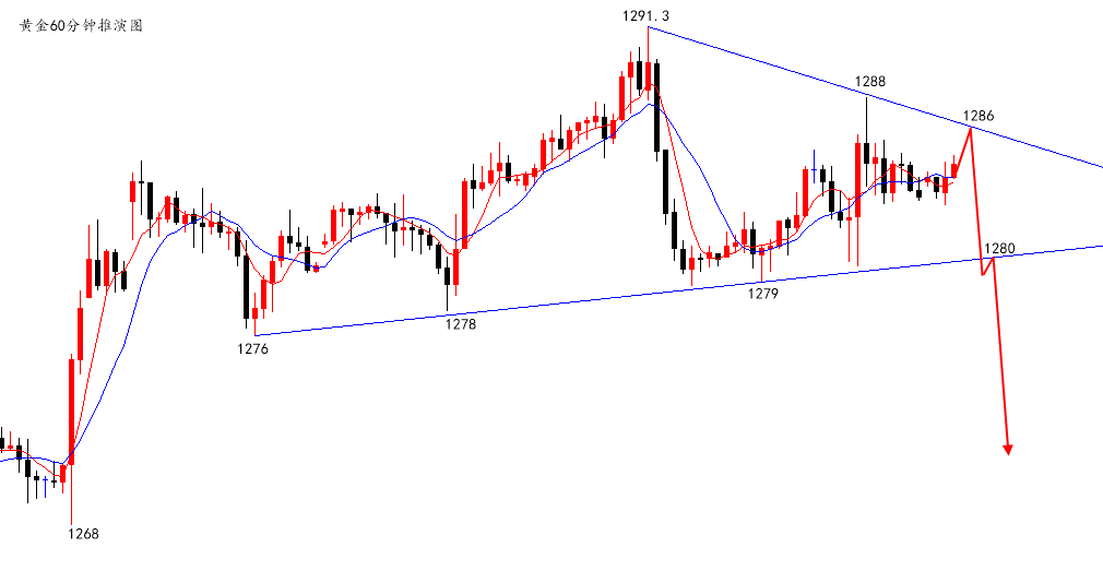 周四,黄金先是探底1280回升,接着冲高1288回落,“震荡”展现的淋漓尽致,震荡的区间越来越小,60分钟呈收敛三角震荡形态。 今日,价格依托1282震荡上行,午后反抽1286回落,刚好在反抽60分钟三角震荡上边线阻力的位置承压,这是为何早间笔者安排1285-7分批做空的重要原因。 另外,日线一直以震荡下跌的模式运行,高点也在不断的下移,是一个明显的以1346为顶部的下跌,没有必要多说。 也许,做空的位置不够好,但顺势总有二次保命的机会;但做多虽有利润,属于逆势,一旦深度的回调,天花板是一定的,这就是我要说的! 所以短线,仍然反弹空为主,只要本周高点1291不破,就是反弹空,一切的反抽都是给