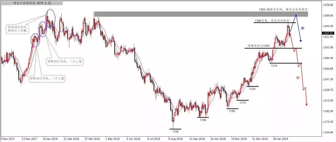 周四,黄金像疯子一样,欧盘多头走得坚挺,美盘空头走得丧心病狂,最终从1327下跌至1312,又创造了新低。 除了用“洗盘”来形容昨日的走法之外,我找不到第二个有逼格的词语来形容。自昨日大跌后,10日均线彻底被击穿,不要再沉迷于之前多头行情之中,从1346承压下跌,连续多个交易日无法修正开始,多头之路注定渐行渐远。 相反,大空头则刚刚开始拉开2019时代的序幕,比较典型的信号有,5周线失守,日线布林带中轨失守,接下来空头要测试两个最近的支撑,一个是10周线支撑1302,这里是前期日线起涨,趋势转折点,一个是日线布林下轨1297。 今天,重点关注1302及1297两个位置,玩命的干空,至死不渝的