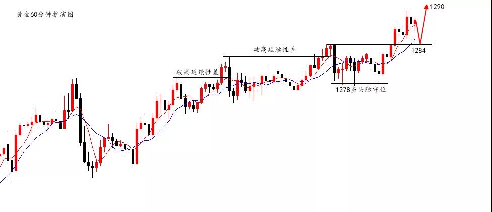 周三,黄金再一次创新高(1288),但每一次创新高之后最多延续2美金就会展开回撤,只不过昨日在美元大涨的背景下,回撤的幅度稍大而已。 虽然,回撤的幅度达10美金,但那也仅仅是昙花一现,凌晨触底(1278)反弹,早间在美日大跌推动下跳空高开至1290一线,缺口直到现在还未能回补,60分钟连阳依然展现多头的强势。 所以,这就奠定了今天继续做多的基础,但破高不延续以及面临1290关口的压制,显然不适合高位追多,只能期待午后或欧盘有回调的机会再去安排多单,如果不能上车也没办法,不是每个人都有勇气去高位追多。 缺口位置差不多就在1284附近,距离昨日低点1278位置6个点的距离,慢涨的行情不能指望过大