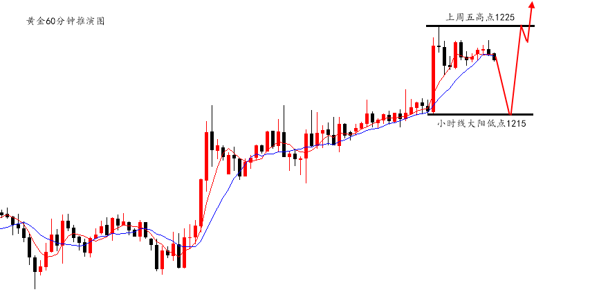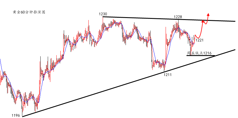 周五,黄金亚、欧、美盘联动下跌,表面上看似弱势,然而凌晨触碰618附近走了探底回升,符合我们之前所说月线、周线、日线偏强震荡运行的观点,尽管日线收阴,但录得较长下引线,说明下方买盘力度仍然较大。 今日,早间跳空高开,急涨回落并没有形成,反而小时线以小型探底回升保持较强的多头动能,那么亚盘暂时以强势对待,也与我们上周看偏强震荡的观点前后呼应。 如60分钟推演图所示,上方主要压制位还是集中在1228-30区域,只有这里突破才能继续向上测试1236以及1243前高,如果不能破位,还将以窄幅区间运行为主。下方,则受到1196-1211上行趋势线支撑逐步震荡偏强运行,上周五低点1216成为了日内多空分