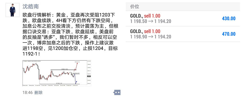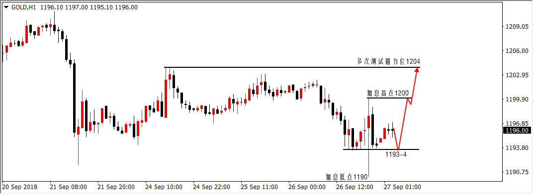 交易中发现自己的错误,就是开悟,改正自己的错误,就是成就。世上没有白费的努力,也没有碰巧的成功,一切无心插柳,其实都是水到渠成;交易没有白走的路,也没有无故的损失,做出的每一个决定,都是未来成功的基石与铺垫。 周三,是万众瞩目的加息日,尽管靴子落地,然1190-1200区间10美金的波动算不上太精彩,1190的探底回升足矣让追空的止损,1200的冲高回落同样可以让追多的扫损,区间运行忌讳的就是追涨杀跌。 在昨日早评中我已经明确强调过不要指望加息的力量可以突破震荡已久的区间,至今为止本周1190-1204区间还是未能突破,这就是事实,你不相信我,一味的追单,我还能把你怎么样? 操作方面,我们安