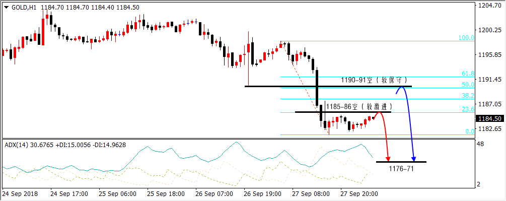 时常对K线保有温度和好奇,不在于一定会让你每天都盈利,而是让你在平静的日子里,不错过每一次爆发的瞬间。交易最遗憾的,莫过于轻易地放弃了不该放弃的,固执地坚持了不该坚持的,拿得起,放得下,才是市场的生存之道。 周四,在美国经济数据表现强劲的背景下美元得以提振,黄金直接以断崖式的方式连续击穿1190、1187关键支撑位,反抽1187之后迎来二次下跌,最终触及1181一线。 隔夜,小幅反弹1185后并没有继续向上延伸,尾盘1182收盘是一种典型的底部收盘,这与上周五1191强力探底回升不一样,大跌之后的底部收盘很明显是弱势的特征。 操作方面,我们根据交易法则“亚盘下跌,欧盘破底,美盘前的反抽要做空