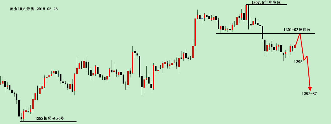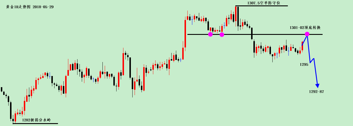 简单回顾一下昨日行情。 黄金,昨日受美阵亡将士纪念日提前休市影响,整个交易均在1295-1300区间窄幅震荡,平静得一天,分析没有多大意义。 今天,黄金走得比较戏剧性,亚盘以1301-2顶底位为开跌口一路下跌至1295-96的位置,其实,上行趋势线支撑1296已经失守,空头继续下行原本是板上钉钉的事情,只不过欧盘开始因为意大