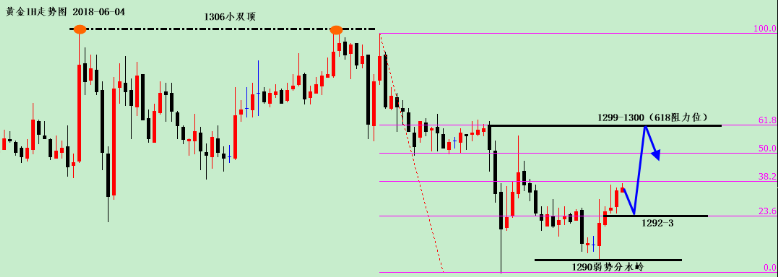 美盘行情解析:黄金,早盘平开高走,午后以1293为开跌口单阴下跌,破位日内起涨点,但并未破位周五非农低点1289,欧盘受美元大跌影响,在1290位置探底回升,小时线连阳上涨并突破日内高点1294,我们说过布局空单必须欧盘下跌,美盘才能继续持有,现在欧盘走强,那么日内布局的1294-5空保守的需要调仓出局,另外日线连阴过后,并非强势,美盘以震荡为主,上方关注618阻力位1299-1300,下方关注1290弱势分水岭,操作上建议1290-1300高抛低吸,美盘前先回撤1292-3多,止损1287,目标1299-1300(跌破1290,多单调仓出局)!先上涨,看冲高回落,触及1299-1300空,
