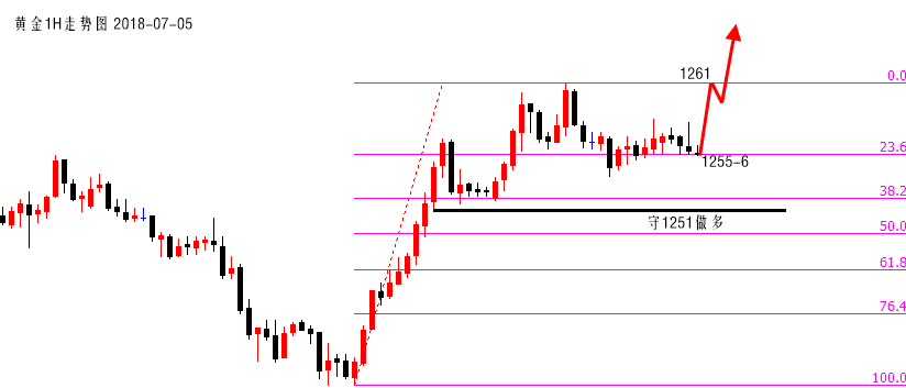 处理情绪的速度,就是你迈向成功的速度,不能因为害怕失去,就不去拥有。总是为未知的行情担忧,却不曾给手中的单加油,常为盈利摆好了酒,可没为亏损留条路。年初的梦想感动自我,年中的总结讨厌自己,有志者立长志,无志者常立志。生活中别成为情绪和环境的污染者,投资中被别情绪污染了环境。太多的时候不是方向不对,不是利润没有,而是没有把握的贪婪害了你。 周四,黄金在ADP及失业金双利多影响下,价格依托1251小双底反弹1260一线,日线探底回升后报收三阳,原本看1237阶段性见底的观点随着1261-0的承压迷雾重重,尽管如此,我们昨日1255-6多,1253加仓多还是能够在1260一线斩获些许利润。 目前,