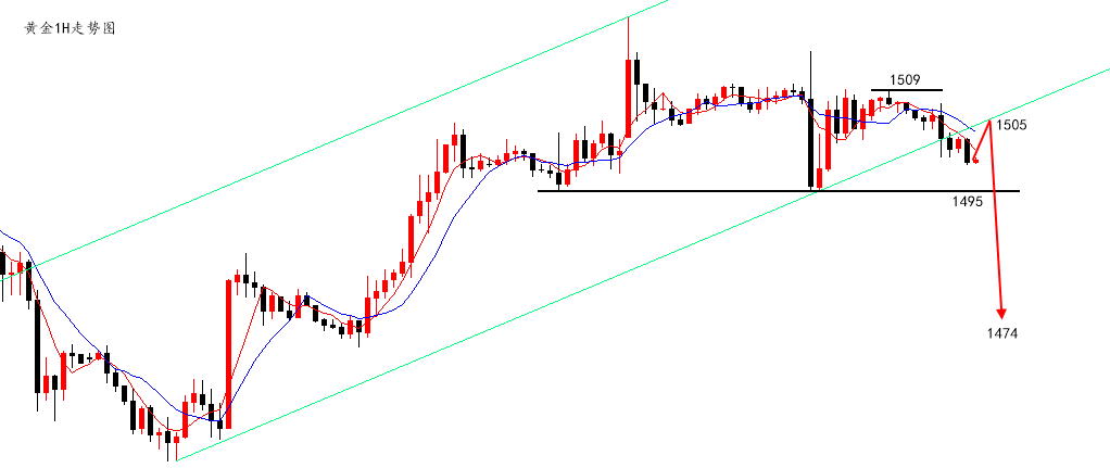 周三,黄金行情比较尴尬,午后及欧盘初连阳,非常好的涨势,在欧盘却连续大阴跌破日内起涨点,美盘震荡之势呼之欲出。这便是昨日行情的真实写照,震荡的不要不要的。 今天,黄金价格受到避险情绪推动平开高走于1516一线,一大早就拉升了10美金,但值得庆幸的是,我们昨日根据“日线下行通道”安排的1515挂单空成交了。 并且早间金价也如期从1515-16的位置下跌,1H单阳连阴,最低跌到了1505,这是对于我们1515-16位置埋伏波段空一个很好的肯定。 短线操作方面,今日依然以空为主,理由是: 日线受压制于下降通道阻力位1515-6回落,这个已经实现; 2.小时线单根阳线,多头无法延续; 3.避险情绪涉