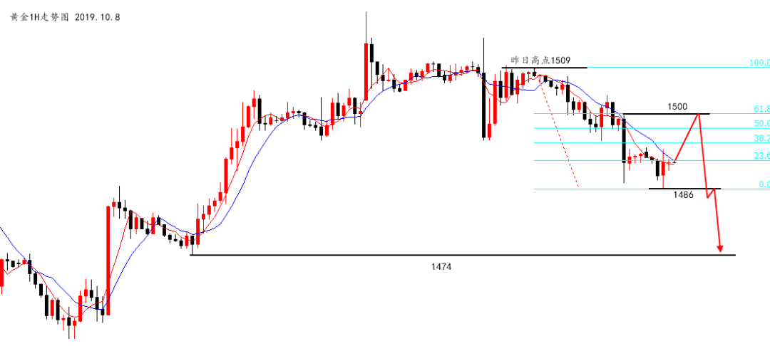 周一,黄金亚盘下跌,欧盘续跌,美盘前反抽,典型“诱多”的行情,最高1509,最低1487,日线最终录得中阴,看空思路没毛病。 若这根中阴出现在下跌行情中,不用多说,今天反弹就是空,无脑空的那种,但是因为此前日线出现四连阳形成支撑,所以今天不能用极弱对待。 另外,早间快速下探至1486并伴随快速回升,昨日低点1487算是刺破,一般非极弱行情中,早盘快速下跌延续性不是很好,因此,今日首要做的就是不要低位去追空了,不说是地板,起码位置一定不会很好。 然后,策略上以空为主,是比较明显的,行情凌晨下跌,一般在次日容易得到二次延续,只是做空位置的选择问题。 有两个比较适合做空的位置,可以参考一下,一是1