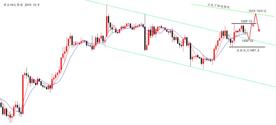 周二,黄金亚盘盘整,欧盘大阳拉起破位早间高点并且连阳,美盘前受避险情绪推动延续上涨并破位1H下行通道,美盘冲高1509回落至1497,上演大反转。 凌晨,探底1497回升上演V型反转,周一的跌势在周二没有得到延续,黄金短线依然是偏强震荡,今日的操作回调低多。 下方,主要关注两个位置,一是破位1H下行通道后需要回踩确认的支撑位置1502-00一线,二是凌晨回踩低点1497;上方,同样关注两个关键阻力,一是昨日高点1509-10,二是日线下行趋势线1515-16一线。 今日思路为偏强震荡,低多为主, 操作上建议日内回调1502-00分批做多,止损1496,目标1509-10,破位看1515-16