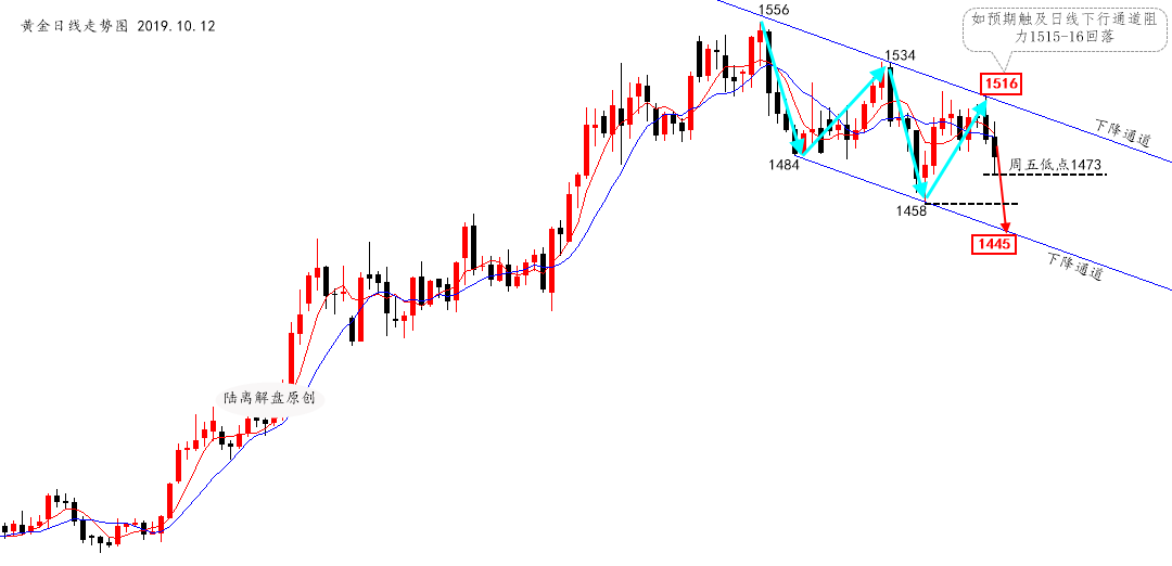 周末我们一起来聊聊黄金,主题是——论波段操作的重要性! 首先,大家可以阅读本周关于三篇波段空操作的文章(主要起到复盘学习作用),第一篇文章是10月7日(周一)首次提出开始波段空操作的《沈皓南:黄金受压制暂不追多;原油反抽空!》,其中明确说到“要在靠近1519的地方尝试一次波段空,目标1445”。 我们的理由主要是根据日线下降通道原理,在通道线阻力1519附近做空,看黄金的第三次下跌,这里的“第三次”是金价自1556阶段性见顶后的第三次。而1445目标位则是根据同等下跌幅度计算的,第一次下跌为1556-1484(72美金),第二次下跌为1534-1458(76美金),平均下跌幅度为74美金,1