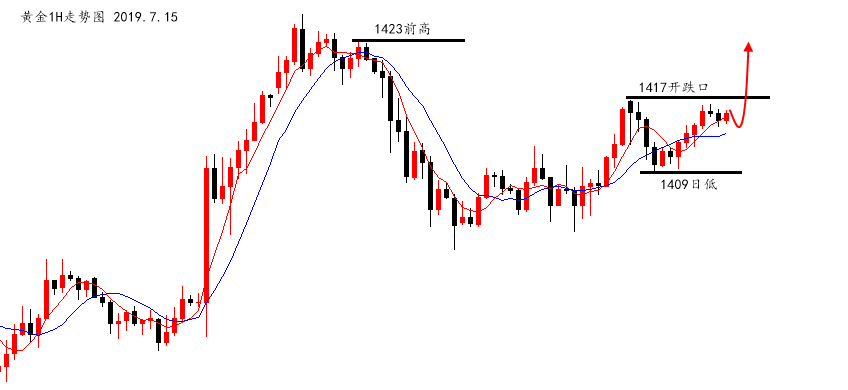 上周,黄金整体上依托1385走偏强震荡,虽后来以1427为阻力回落1400一线,但并没有改变周线中阳的成立,周线又一次回踩MA5回升。 周五,日内走势平淡,围绕1412-02进行窄幅震荡,这种行情没法做,我们也只能早早的空仓休息。 凌晨,黄金价格依托1407-08开始上涨,慢涨连阳,1416收盘,日线中阳,形态上呈现“类阳吞阳”。 为什么是“类阳吞阴”?因前一根阴线的上影线部分并没有吞没,只是将实体部分吞没,因此我们用“类阳吞阴”来形容,“阳吞阴”形态是看涨的,这一次的“类阳吞阴”我们暂且看做看涨形态吧,至少,做空不可取。 今日早间开盘,黄金价格以1417为开跌口向下回撤,小时线四连阴,触及