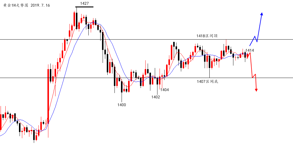 周二,黄金报收中阴,日内窄幅震荡,就6-7个点的波动;直到美盘开盘,6月零售销售月率利空使黄金价格直接从1414-5快速下跌至1408-07,我们欧盘公布了一张现价单,1414-5的空,实盘也提示1408一线挥刀收割。 隔夜,鲍威尔讲话促使黄金又一次过山车,先冲高1413,紧接着快速回落1400,这种消息面行情,想做可以做,但请一定带好止损。 尾盘,探底1400回升,小时线看1400双底支撑有效,因为探底回升的幅度不是很大,所以并不能阻止日线收阴,自此,日线二连阴,打破近期阴阳循环格局。 虽说阴阳循环格局打破且日线连阴,但并不一定要去追空,我认为其一,上面说过,尾盘探底1400回升后,基本确