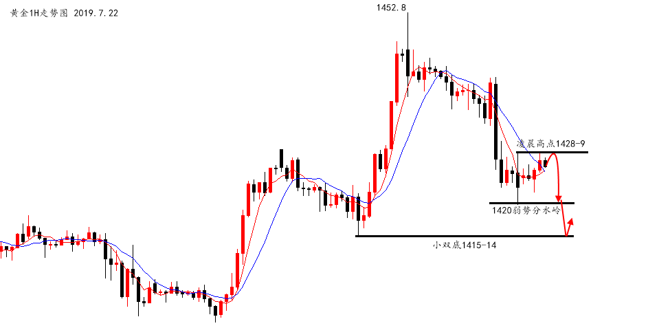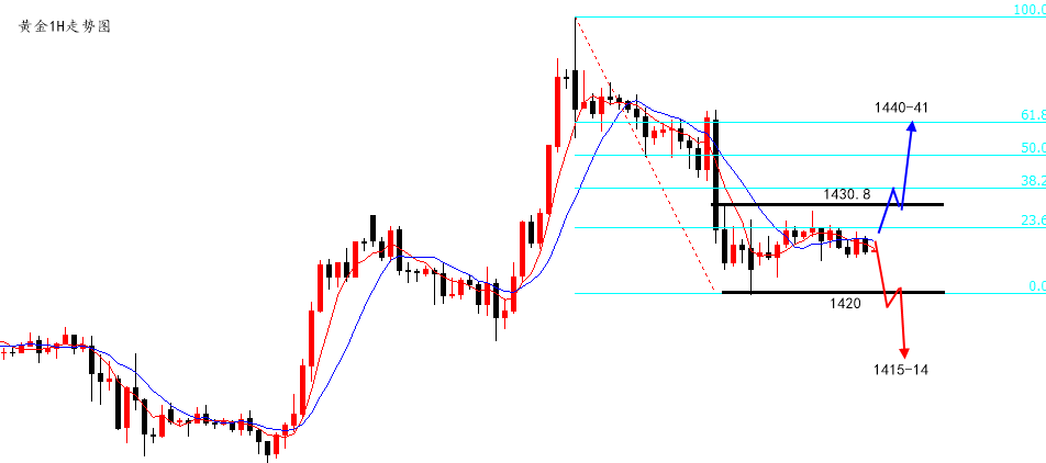 周三,黄金又一次反反复复,亚欧盘以1407位压力点完美破底,但美盘受美联储鸽派言论以及美指受打压,加上消息面利好,使黄金拉升最高到达1426一线。 今天早间,黄金价格平开高走后快速的回落,横盘过后,午间二次快速回落1418一线,又快速上涨1423-4一线,波动速度之快让人措手不及。 但好在没有在开盘后追高,不然就是大大的天花板了。亚盘行情解析,我们明确提示,虽然日线报收大阳,但整体行情还是处于震荡,并非极强,高位不可以追多,而结果也是如我们所分析的。 不追多,但不代表今天我们不去做多,日线本身偏强震荡,加上昨日大阳,欧盘没有任何理由去做空,所以今日低多为主,博欧盘二次上升。 亚盘说过,141