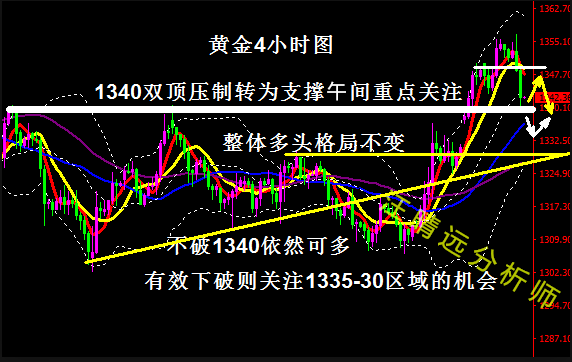 黄金承压,后市强劲突破需要时间 本月贸易战的开始使得全球市场受到震动。但是美国和中国将开始谈判的希望在一定程度上缓解了贸易战担忧。昨天随着美元指数回升,非美货币普遍下跌,英镑一度跌超1%,日内暴跌近200点,跌至四个交易日以来的最低水平1.4064;欧元跌破1.24关口,最低下挫至1.2371;现货黄金一度失守1340关口,