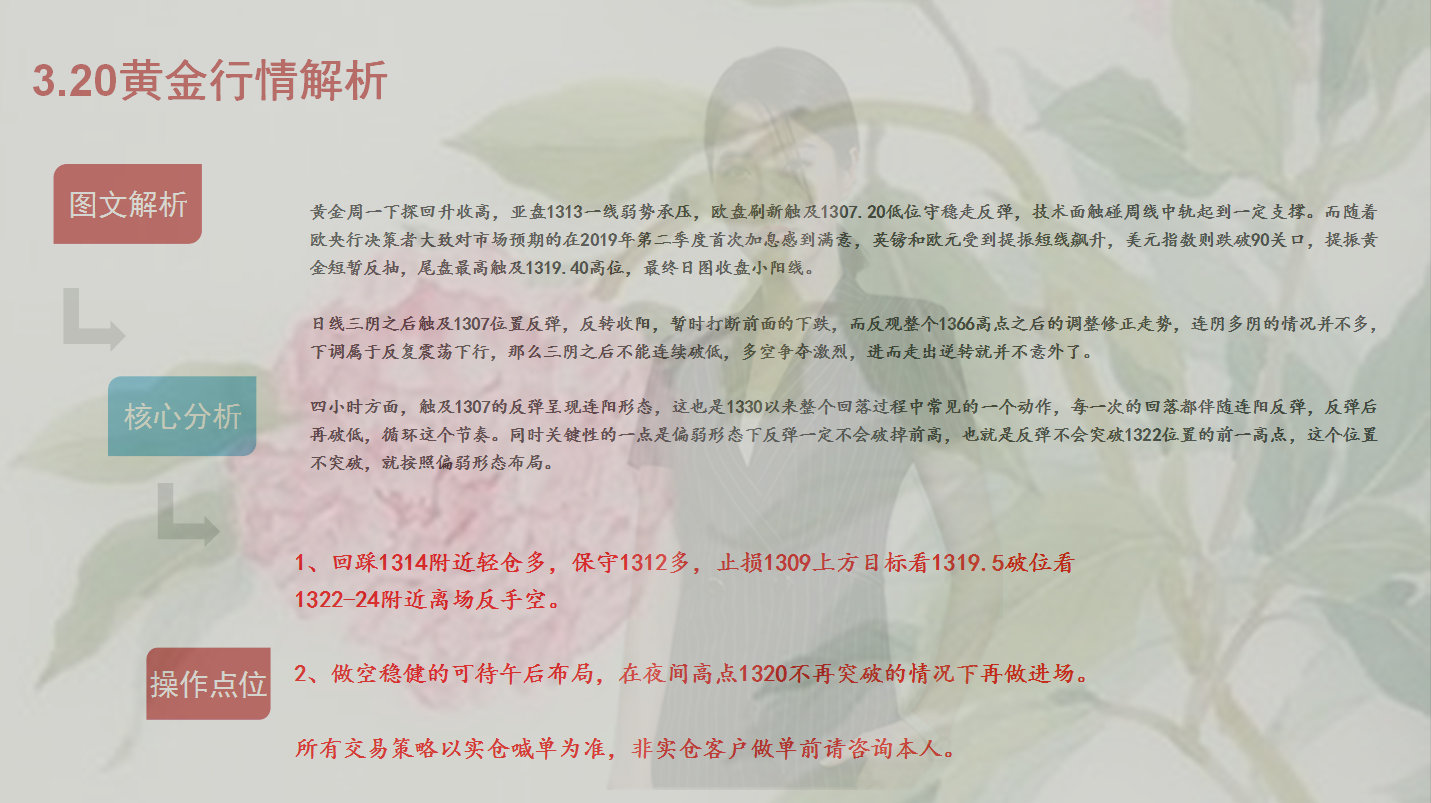 童曦兮:3.22抓住行情多空反转,昨晚到今早黄金盈利近45万! 所谓一个靠谱的人,凡事有交代,件件有着落,事事有回音。应用到黄金投资上就是开仓有把握,建仓有着落,持仓有风控,平仓有利润。童曦兮一直致力于市场,是金子总会发光,鱼龙混杂的市场,吹嘘得来的认可,总会原形毕露,唯有坚持写出对投资者有用的分析,能让投