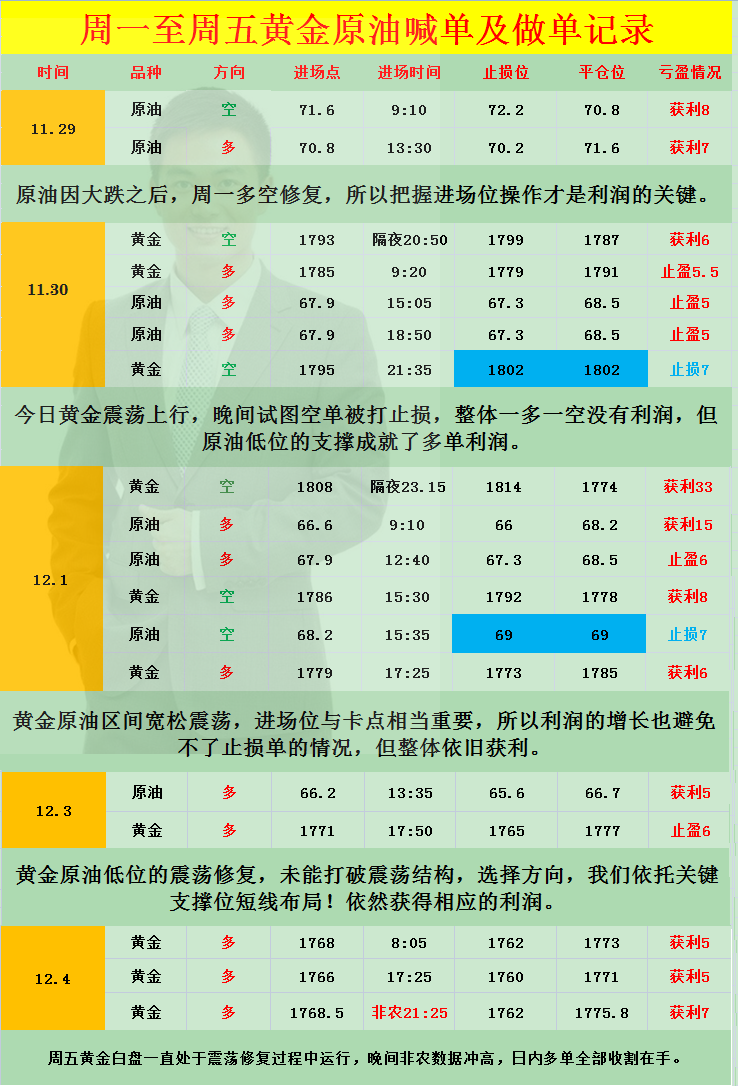博旺论金文章摘要:2021年12月3日新手炒黄金需要知道哪些常识?12.3黄金低位震荡后市 还会涨吗?12.3黄金多单被套怎么解套?12.3原油大跌能否抄底做多?12.3本周大非农黄金还会跌吗?12.3今日黄金大趋势多空怎么看?12.3伦敦金中长线如何稳健布局?12.3晚间有哪些数据要公布? 周四日内黄金原油做单策略及现价单记录都沉陷在表格之中,我们做每一单都要做到,有根有据,让一些亏损的朋友或者做单不理想的朋友,找回自信。每当,我看到自己的客户能够稳定的赚钱,博旺也替,她,他,们开心,博旺认为赚钱需要节奏,做单需要实力,可以说不管行情怎么走,到达我们提前预判的做单位置