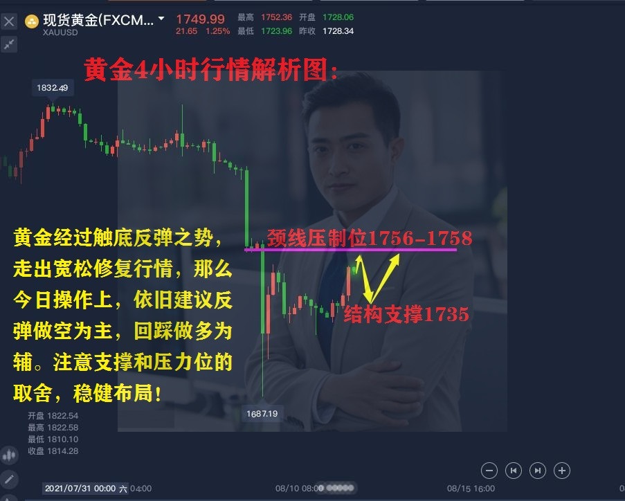 李鸿涛文章摘要:2021年8月号13新手炒黄金需要知道哪些常识?8.13投资外汇黄金能赚钱吗?8.13黄金大趋势看涨看跌?8.13黄金走势还会跌吗?8.13黄金怎么做才能避免爆仓?8.13黄金多空怎么看?8.13原油大跌能否抄底做多?8.13黄金区间震荡后市还会涨吗?8.13黄金中长线怎么操作? 黄金原油行情回顾: 周四,黄金开盘在1749附近震荡修复,上午时段开始延续短期反弹之势,最高反弹1758一线,受压回落。那么此位置也是我们在早间文章中,以及分析图,给到的做空位置,所以在行情触碰此位置时,等待K线形态的出现,我们空单选择性进场。因白盘行情震荡整理较大,为了完全期间,