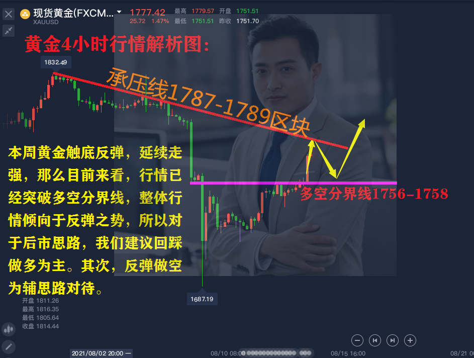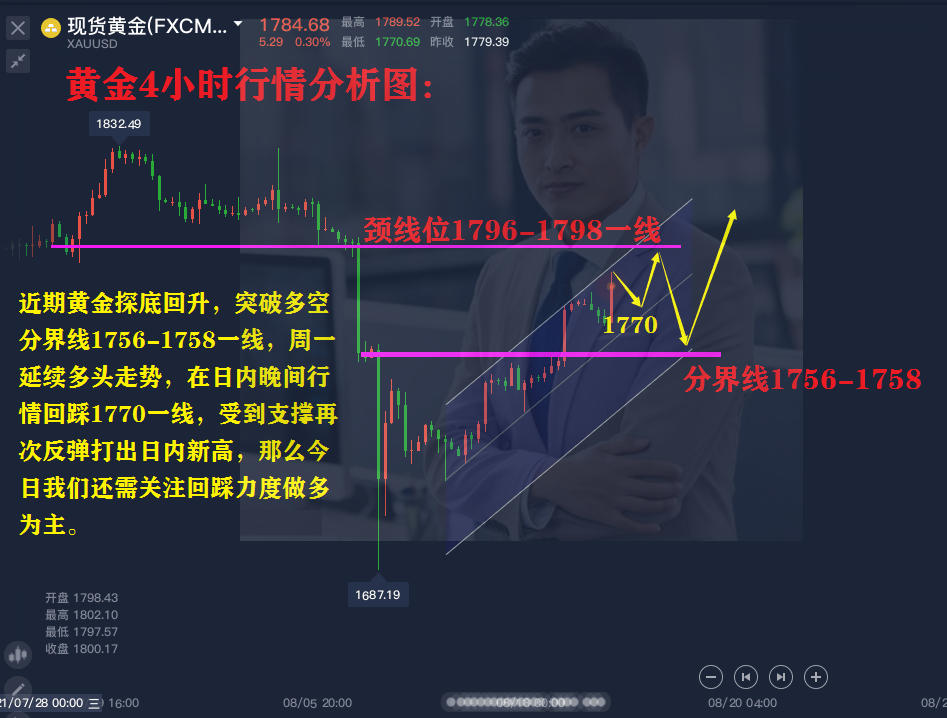 李鸿涛文章摘要:2021年8月号17新手炒黄金需要知道哪些常识?8.17投资外汇黄金能赚钱吗?8.17黄金大趋势看涨看跌?8.17黄金怎么做才能避免爆仓?8.17今日黄金多空怎么看?8.17原油大跌能否抄底做多?8.17黄金多头再次重演今日还会涨吗?8.17本周黄金中长线怎么操作? 周一行情回顾: 早间黄金开盘在1779附近,整体行情陷入震荡修复阶段,那么在晚间行情走弱,回踩至1770一线,触碰短线支撑位行情瞬间止跌反弹,那么在行情二次回踩确认支撑的有效性,我们多单布局进场,随后行情延续反弹之势。多单止盈出局!那么行情最终反弹至1789一线,说明周一行情多头走势依然那么强劲