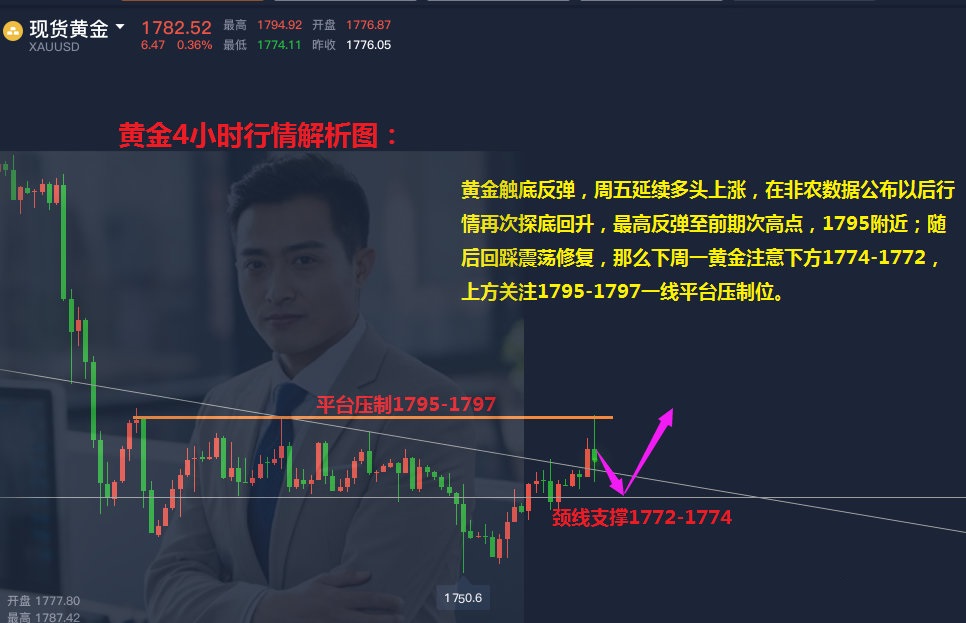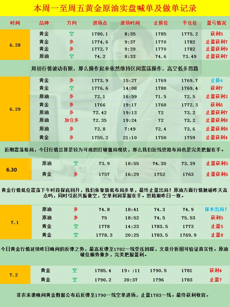 李鸿涛文章摘要:2021年7月4号新手炒黄金需要知道哪些常识?7.4投资现货黄金原油能赚钱吗?7.4黄金大趋势还能看空吗?7.4伦敦金空单被套怎么解?7.4美元的涨跌对黄金有什么影响?7.4做黄金怎么才能避免爆仓?7.4下周一黄金还会涨吗?7.4下周黄金中长线怎么做单? 黄金原油行情回顾: 今日周五黄金久违的一个月一次的大非农数据即将公布,那么我们在白盘时段,黄金已经操作两波,多,空,单,全部盈利出局! 待观望非农的公布,那么在非农公布后行情探底回升走强,最高触碰1795-1797一线的前高压力位区域,随后受压回踩。那么我们在行情首次反弹至1790一1792一线就已经通知所