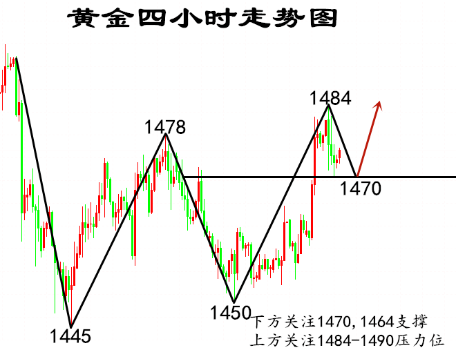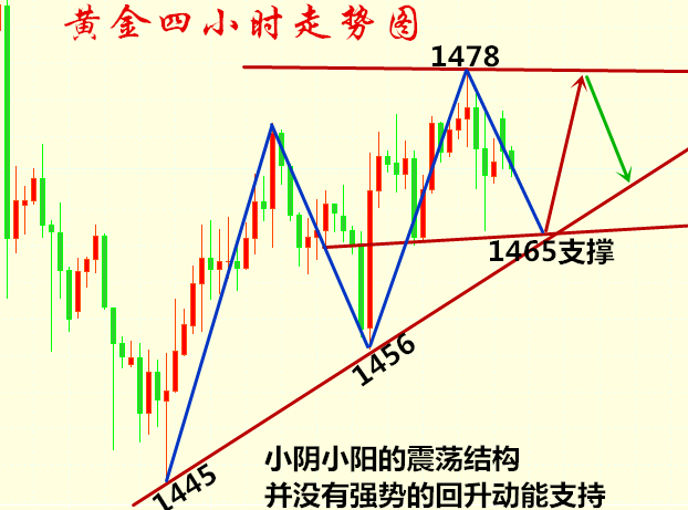 这个市场就像电影放映室,每天数不清的人一批批的来,一批批的走,有些人交学费得到了经验和心得,后面东山再起的可能性较大,可有些人却如同丢盔弃甲般心神俱伤,如果心态都已经崩溃了,那么我劝你先停下脚步,好好反省和平静自己的心态,不然将连番受挫,到时候不仅资金出现危机,人也会一步步是去意志,如果我们是相信自己能做好的,胜不骄败不馁,那么美好的生活就是来日可期的! 【叶悠远11.22黄金行情走势分析】 黄金4小时点旗形整理还在延续,BOLL的支撑位置1462一线,也是当前走势图的第一个支撑,1460附近的支撑破位,那么黄金下行风险加大。 日K目前是拖地金叉,这里走势可上可下。上则是去1482-1488