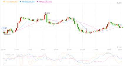 本周伊始,市场仍在继续消化贸易紧张局势,风险情绪的回归使得美元继续承压。周三(9月19日),受益于美元走软,黄金小幅上涨,此外风险偏好也予以支撑。美市盘中最高上探至1206.12美元,金价重返千二关口上方,表现抢眼,目前美指继续维持疲软状态,金价震荡交投于1200美元关口上方;原油方面,美油涨逾2%,受美国原油库存连续五周下降提振,且国内汽油需求强劲,市场持续担忧全球供应。 本交易日,投资者需关注瑞士9月央行活期存款利率、英国8月零售销售月率、美国截至9月15日当周初请失业金人数、美国8月成屋销售年化总数、欧元区9月消费者信心指数初值。 黄金走势解析及策略: 目前金价整体走势依旧较为震荡,日