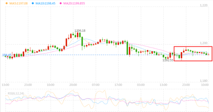 周一因美国总统特朗普有意再度威胁升级中美贸易战,这对市场信心构成打击。受市场人气低迷影响,避险需求不断升温,美元亚盘守住上周五的涨幅,并试图进一步攀升。不过一则脱欧相关的消息刺激市场风险情绪抬头,导致美元指数小幅回落,不断回吐亚盘的涨幅,美指一度逼近95大关,最低触及95.02水平。而黄金自低位展开反弹,最终触及1198美元附近,整体徘徊在1190/1200区间内。本交易日欧洲市场将迎来系列数据的考验,英国方面就业数据则是关注重点,这是英镑涨势能否持续的关键。与此同时,投资者还将关注贸易局势方面的最新进展,可能也会引发市场的剧烈波动。 黄金走势分析: 昨日黄金价格区间波幅1192-1198区