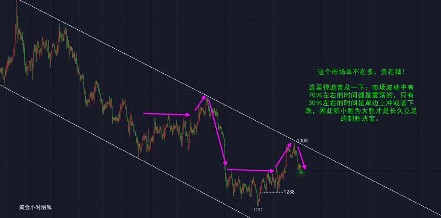 上个交易日,金价开盘于1301.05,最低下探到1297.5,最高上涨至1306.46,收于1298.20。博文中笔者多次强调,1308不破,黄金高空不变,不知有多少人跟上了?今天周五几乎市场都在等待晚间公布的重磅数据,5月非农就业报告。 但笔者想说的是,现在的非农已经没有那么令人神往了。就算一个非农行情,你最喜欢做的黄金,波动也就15美金的区间。而这个区间就算没有数据的刺激,平常的交易日也能走出这样的区间。那么区别是什么?非农公布之后的30分钟能走出来,而平常需要很久。 时间久一些,你有更多的时间去分析,做准备,而这种数据行情来去匆匆,交易中理性更少,其结果就是震荡来回扫,单边行情深套。当