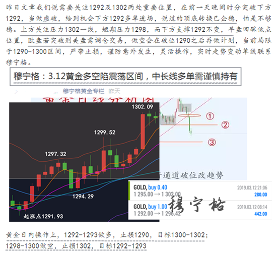 宁赴流而葬江海,言有物而行有格”是以为宁格,擅长轻松盈利,拒绝操作失误! 翻手为云,覆手为雨 ,精准布局,正轨运行 昨日价格全天走跌,好在价格未能打破下方1292一线,未能打破92进入前一轮筑底箱型整理区间,凌晨辛苦维持的1295附近低位震荡,在上午日本利率决议公布,美元指数急跌,又一次避险刺激金价上涨,此时接近我们预定的1292-1302区间边缘,欧盘前达到千三附近,一次拉升至1299,当前行情并非非常弱势,那么今日区间变成1292-1304,千三多空强弱分水岭,回踩1295附近可以博弈多单,多单止盈参考1302,看好欧盘动向。严带止损,谨防意外发生,灵活操作,实时走势变动单线联系穆宁格。