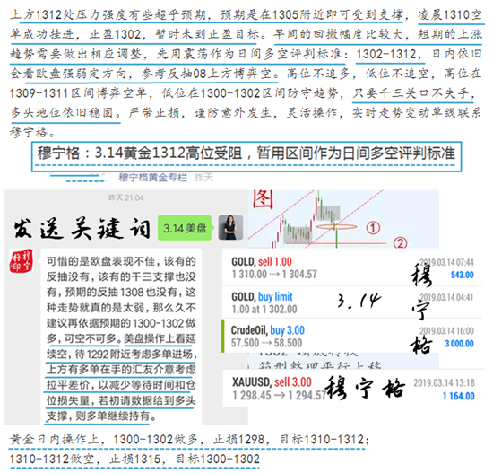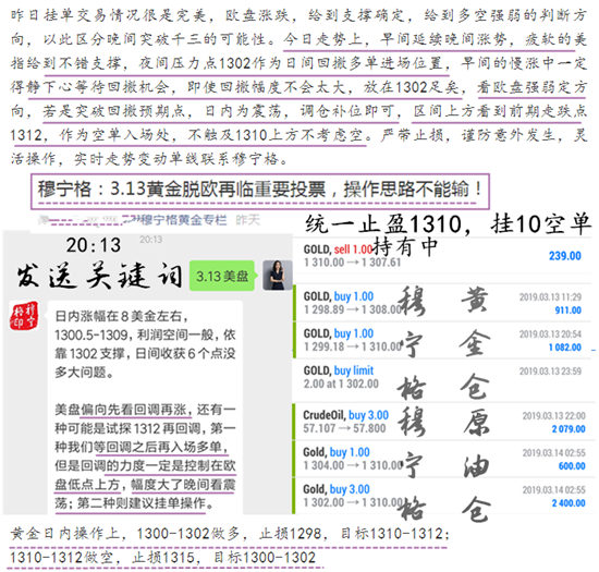 宁赴流而葬江海,言有物而行有格”是以为宁格,擅长轻松盈利,拒绝操作失误! 翻手为云,覆手为雨 ,精准布局,正轨运行 昨日挂单交易情况很是完美,欧盘涨跌,给到支撑确定,给到多空强弱的判断方向,以此区分晚间突破千三的可能性。今日走势上,早间延续晚间涨势,疲软的美指给到不错支撑,夜间压力点1302作为日间回撤多单进场位置,早间的慢涨中一定得静下心等待回撤机会,即使回撤幅度不会太大,放在1302足矣,看欧盘强弱定方向,若是突破回撤预期点,日内为震荡,调仓补位即可,区间上方看到前期走跌点1312,作为空单入场处,不触及1310上方不考虑空。严带止损,谨防意外发生,灵活操作,实时走势变动单线联系穆宁格。
