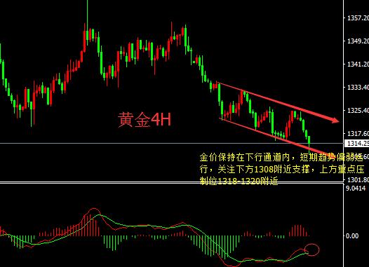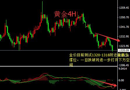在地缘局势和贸易摩擦缓和的背景下,黄金价格逐步处于弱势格局中,以此同时,近期美国数据偏好,市场预期美联储年内四次加息预期增强,同时美国收益率升高,持续打压黄金价格走弱,金价连续三个交易日回落,测试箱体区间下沿支撑位,短期内受支撑于1320美元/盎司。 走势上,黄金价格日内符合笔者金振煜近篇文章中撰写,金价