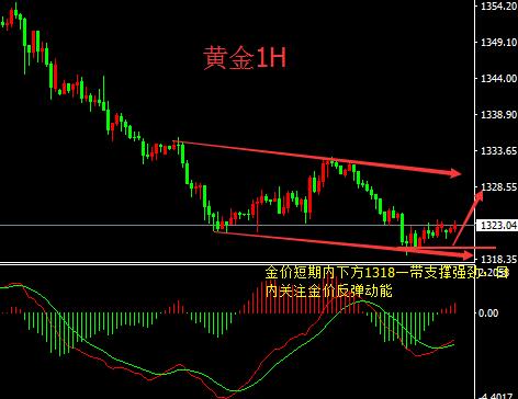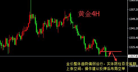 昨日市场焦点欧洲央行利率决议及德拉基新闻发布会,最终欧元先扬后抑,短线跳水逾100点,同时,美国最新经济数据表现强劲,提振美元指数再次走高。在美元指数的强势影响下,现货黄金在巨量抛单的打压下加速下滑,短线急跌逾10美元,整体趋势偏弱运行。 黄金价格昨日上行至1326附近受阻后,受市场利空因素影响,持续走出回落