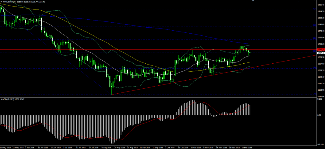 今天先看消息面,昨天比较受关注的美国11月CPI数据表现与前值持平,市场行情也继续维持清淡,当然昨晚英国首相特蕾莎·梅面临英议会发起的不信任投票挑战中获胜,英镑实现暴涨,因此也对形成打压,美指的走低也为黄金带来上涨的契机,隔夜金价能够在清淡行情中收涨也属正常。 目前技术面上的指示意义性一般,从黄金1小时图中看,黄金基本沿着趋势线做震荡运行,布林带尚能保持升势,MACD于0轴上方下行,多头能量柱连续收量,暗示金价短线将小幅走低,KDJ三线未形成交点下行属惯性走低,因为也不能判别行情会连续下行,我预计还是一个震荡行情。 另在日线级别中看,布林带的开口趋势依旧维持,行情也长时间运行于上轨下方,MA
