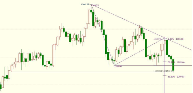 上周黄金日线收得三连阳,当市场普遍认为这是一个多头的良性开端,结果周四却直接砸出来一个大底,突破了筑底颈线1293,回吐所有的涨幅!从日线图来看,目前价格处于大势的震荡回落的阶段。 今日早间便是一路跌跌不休,美盘之后就是多空来回扫荡,形成一个震荡局势。有一点儿要注意的是,前期黄金是急跌,而今日连跌10美金左右,用了整整一个交易日,说明并不是极弱行情,那么本周破位1280之前,大概率是个震荡行情。 不少套着多单的朋友,都不明白为什么涨势好好的,突然就跌下来了。其实,有持续关注的我的朋友,就知道黄金为什么会跌。日线头肩顶形态已成,反弹不破1320中轨是空,下方1280是多头最后一道屏障,若是跌破