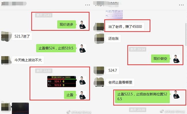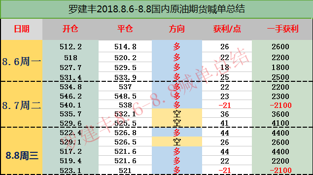 一周已经过去,又是新的开始,上周喊单依旧不多,也不建议大家频繁操作,每天机会都很多,但是赚到才是自己的。 【国内原油期货】【上周喊单总结】上周原油整体走出了一个双顶结构,先涨后跌再涨再跌的行情,最大波动18元合计180个点,上周喊单依旧不是很多,总共喊18单,止盈14单,止损4单,总获利216个点,操作一手获利21600元,操作十手就可获利216000元,整体一周下来收益还算不错,建丰看重的也是一个安稳长久的收益,不求一夜暴富,只求安稳盈利,不知道大家上周收益如何,以大家的仓位情况又能获利多少呢? 昨日原油夜盘再度强势上涨,最高上冲至536.7接近涨停点位537.2,晚盘给出两次多单都止盈出