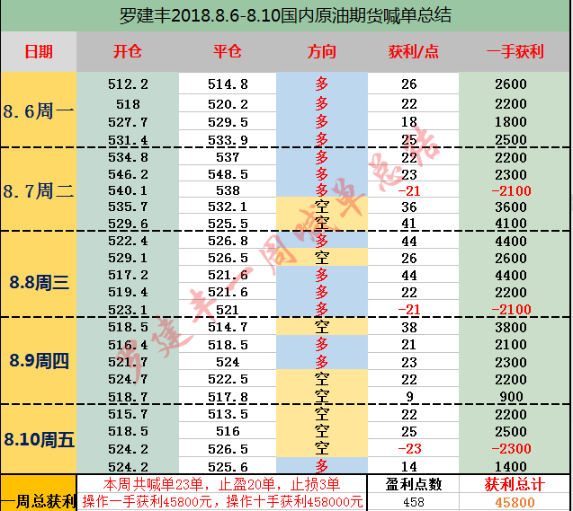 时间过得很快,又到一周做总结的时候了,投资市场总是有人亏损有人赚,这点毋庸置疑,也是二八定律,正是因为如此,那么你就甘愿亏损了吗?我想不是,只是你没有找到一个好的操作体系和客观对待市场变化的心态! 回顾本周,不为别的,只是鞭策自己,总结自己走过的每一天,看看自己的目标有没有完成。我想大家亦是如此,周末不仅仅是让自己忙碌的一周好好休息,也是给自己做总结的时间和机会。只有学会总结,培养自己的原则,不让自己迷失在投资的道路上,你才能走得更远,站的更高! 国内原油期货本周强势上涨,创下历史新高,整体走出一个冲高承压回落走势,操作上也是保持顺势而为,本周共计喊单23单,止盈20单,止损3单,总获利45