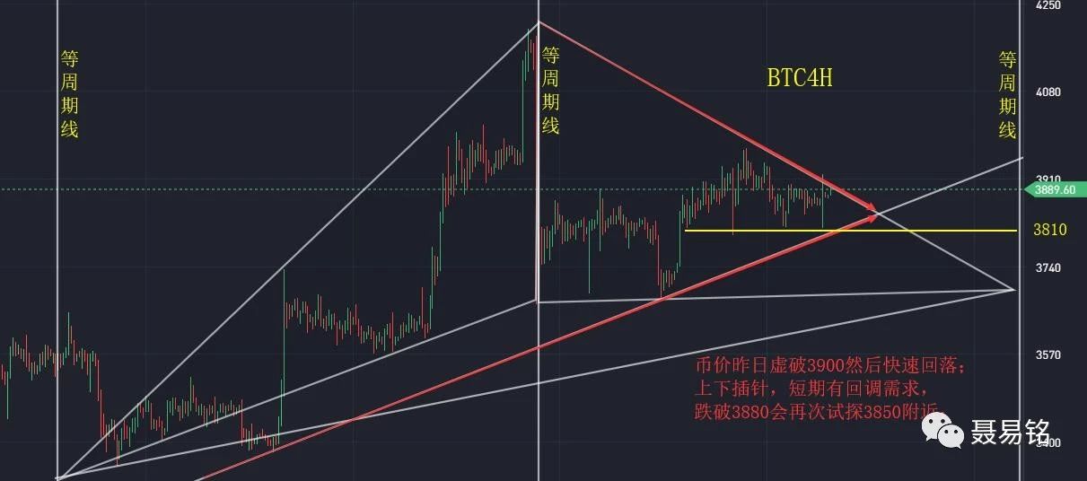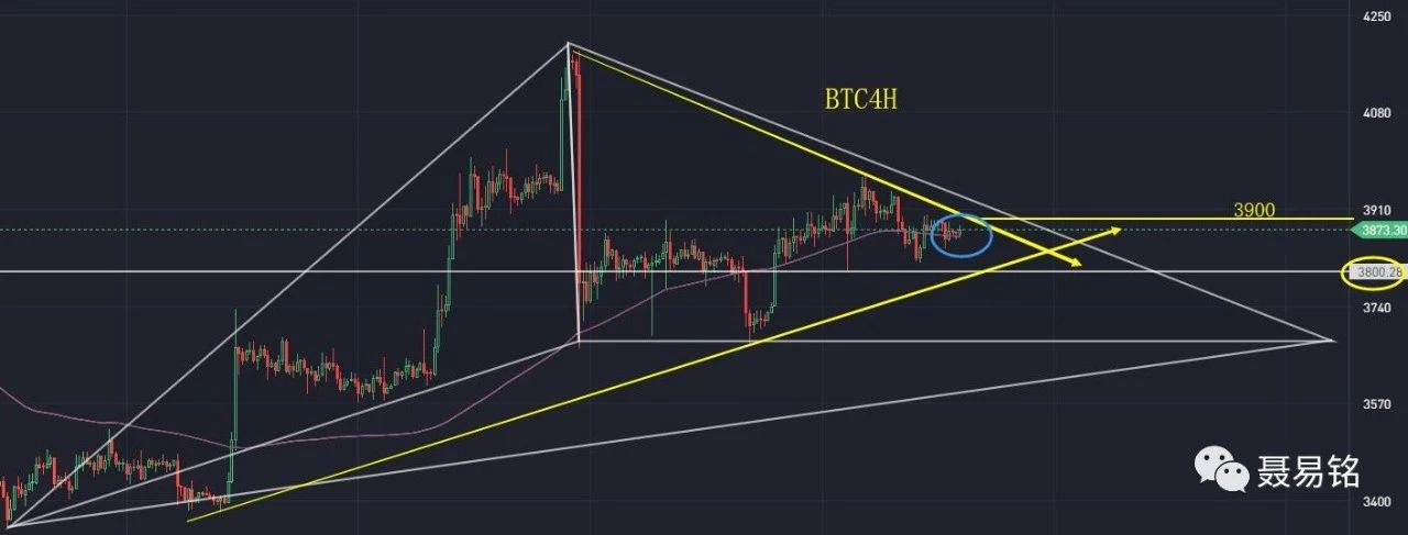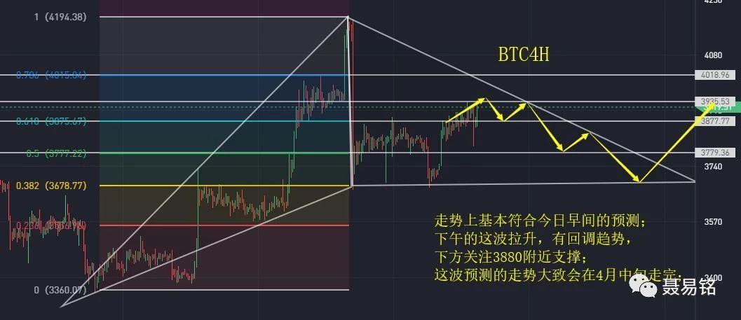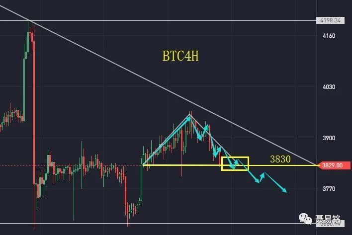 聂易铭:3月12日数字货币大盘领跌,多空转变已落地 先来回顾昨日的行情,昨日晚间行情预测完全符合昨日晚间文章中的行情预测,币价持续下行,受制于三角形楔形区间内,币价在3月10日受阻回落后,持续走低,虽然在不断的下跌中,在关键的支撑位置都会有所反弹,但是反弹高度均不超过前方高点,上涨动能不断减小,聂易铭预计最终币价仍将会回调到3680附近,打破楔形区间后开始多头占优;短期看空,大趋势看涨,具体解释可看聂易铭9号的文章中对大趋势的预测及分析; (上图为昨晚BTC1H走势预测图) 今日具体分析大饼四小时周期上走出倒V型,颈线位置在3830附近,当前处于多空转换的关键时期,就看下方3800-3820