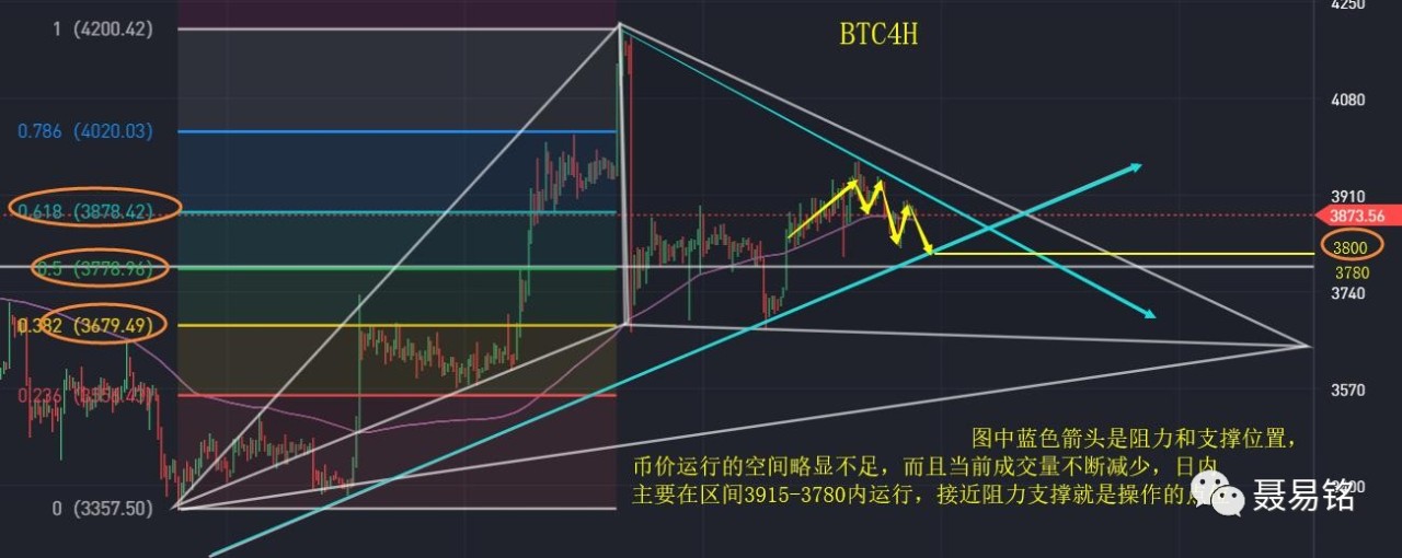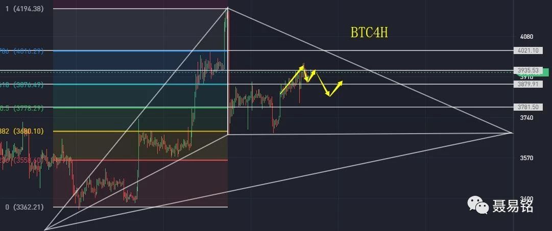聂易铭:3月11日数字货币所有的涨幅都是庄家在耍流氓 周末几天主流币的波幅极为有限,成交量低迷,维持在小区间内震荡运行,币价也在不断缩减,日线上基本都收了小阴线,而且还在不断变短,各主流币震荡区间均下移。聂易铭认为币价近期的一切涨幅都是庄家的流氓行为,有很大的诱多嫌疑! 还是回到具体的行情上来,大饼上周就已经说过大趋势在慢慢的朝向阴跌发展,会再次走出一个三角楔形,四小时周期上,大饼站上3900之后多次震荡上行力度都不大,而当前上行愈发困难,后市偏跌发展,其次聂易铭认为,币价至少要先站稳在3950上方,才能试探斐波那契78.6%(4016)位置。而下方的首要支撑是在斐波那契61.8%(3880